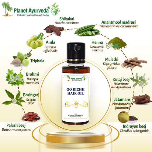 Go Richh Hair Oil is a premium Ayurvedic formulation made with a blend of traditional herbs and nourishing oils. Designed to support the appearance of strong, smooth, and lustrous hair, this oil enhances your scalp and hair care routine. Infused with botanical ingredients like amla (Gooseberry), Bhringraj (Eclipta alba), and Brahmi (Bacopa monnieri), it helps moisturize the scalp and condition the hair, leaving them soft and manageable.