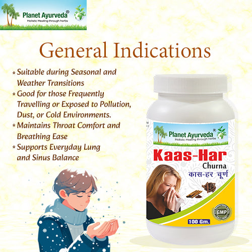 Kaashar Churna is a powder formulation prepared using herbs like Vanshlochan (Bambusa arundinacea), Pippali (Piper longum), Ela (Elettaria cardamomum) etc. All these herbs are amazing and possess Bronchodilating, Immune modulating and Anti-inflammatory benefits thus helpful in managing Allergy, Allergic rhinitis, Cough, Cold and sinusitis.