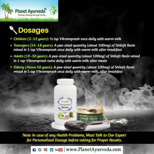 - Elderly (Above 50 years): A pea-sized quantity (about 100mg) of Shilajit Resin mixed in 1 tsp Vikramprash once daily with warm milk, after breakfast.